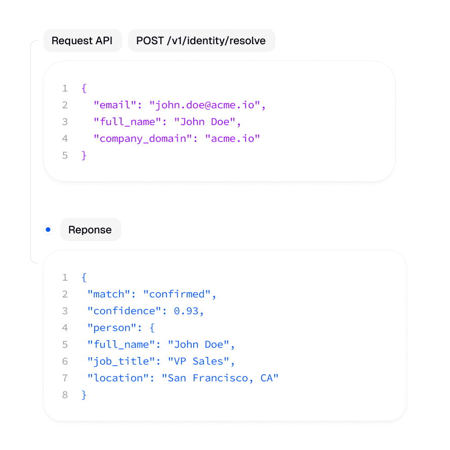 Yes. You can use our API for on-demand resolution, bulk exports for backfills and warehouse pipelines, and webhooks for asynchronous delivery — so you can decouple your workflow from latency and timeouts.