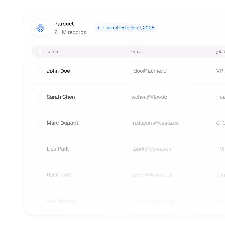 Build market views by industry, headcount, geo, and growth signals in your warehouse.